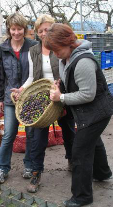November 2007 - unsere fleißige Stammmannschaft schüttet den ersten Korb in den Schlund des Trichters der Mühle in Millena.