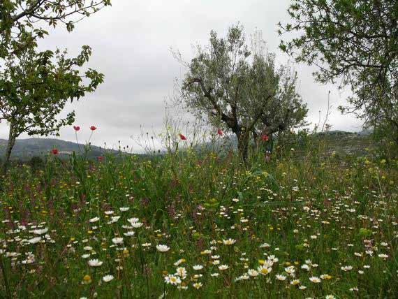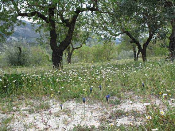 Frühjahrswiese in unserem Olivenhain. Links im Vordergrund Traubenhyazithen (muscari)