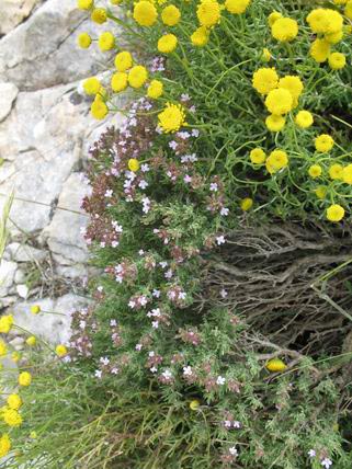 Links: Campanula - Glockenblume -in Felsenspalte, Mitte rechts: Thymian