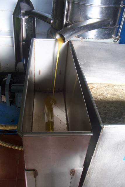 Ein erhebendes Gefühl: Unser allererstes Öl am 16. November 2005 !!!! Limonengrün und trüb: so sieht Olivenöl aus, das frisch dem Separator (trennt Olivenöl und Wasser) kommt.